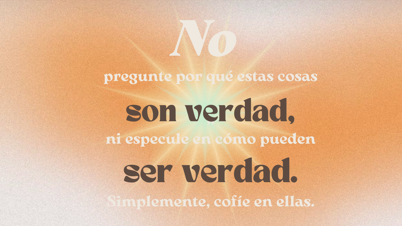 Fue hasta esta mañana que entre tanto estrés, duda e inseguridad de mi Universo, leí esta frase y todo pareció esfumarse. El Universo me está pidiendo creer y dejar de cuestionar, confiar en que existen y entregarme a esa única verdad. Mi vida ya no quiere más dudas, ya no quiere preguntas sin respuestas, quiere paz, confianza y plenitud. Por ello decido soltar lo que hasta ahora no ha funcionado y decido escuchar al Universo y confiar en esto sin volver a cuestionar sus formas.